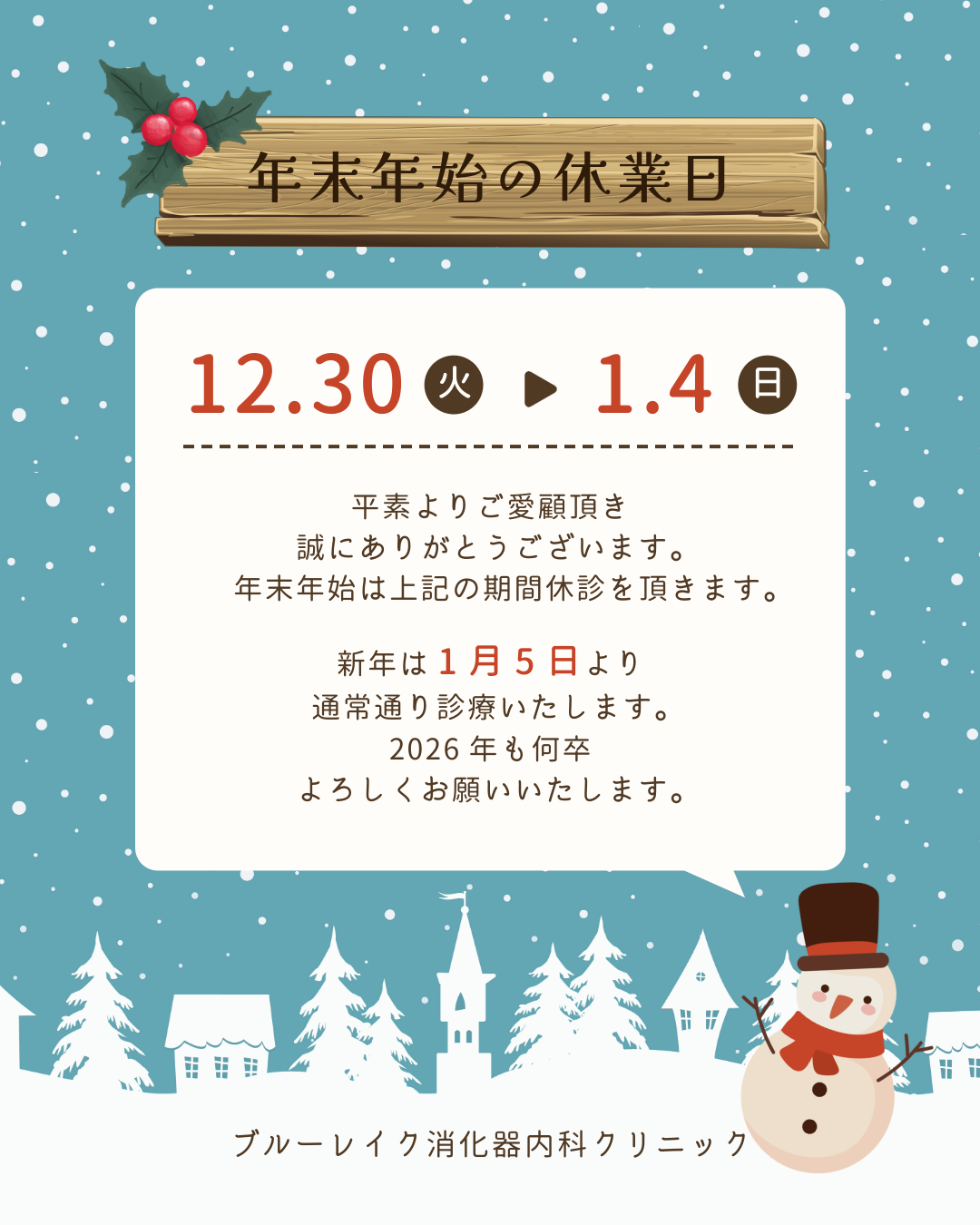 12月30日(火)から1月4日(日)まで全日休診とさせていただきます。